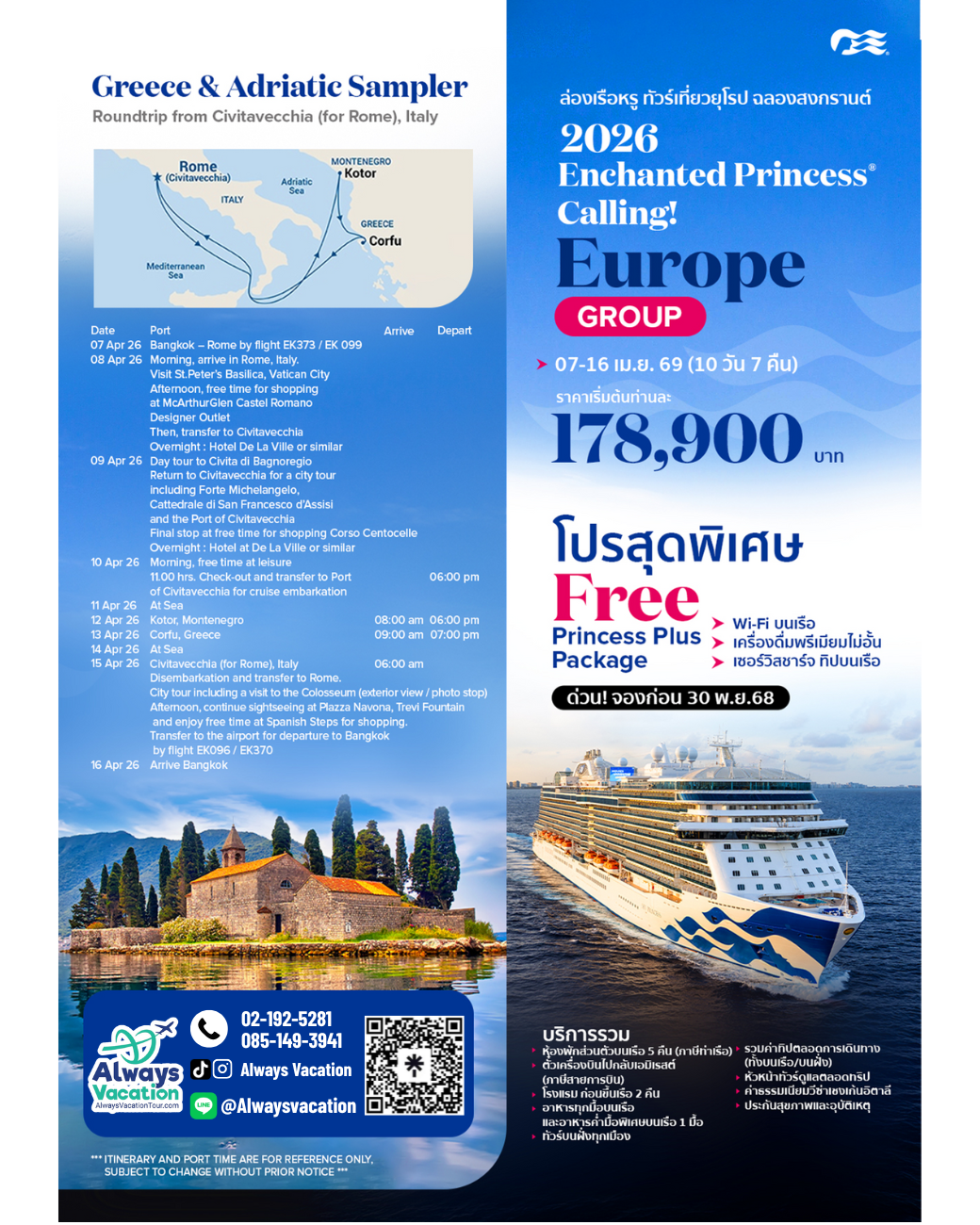 ล่องเรือหรู ทัวร์เที่ยวยุโรป ฉลองสงกรานต์ 7 - 16 เม.ย. 2569