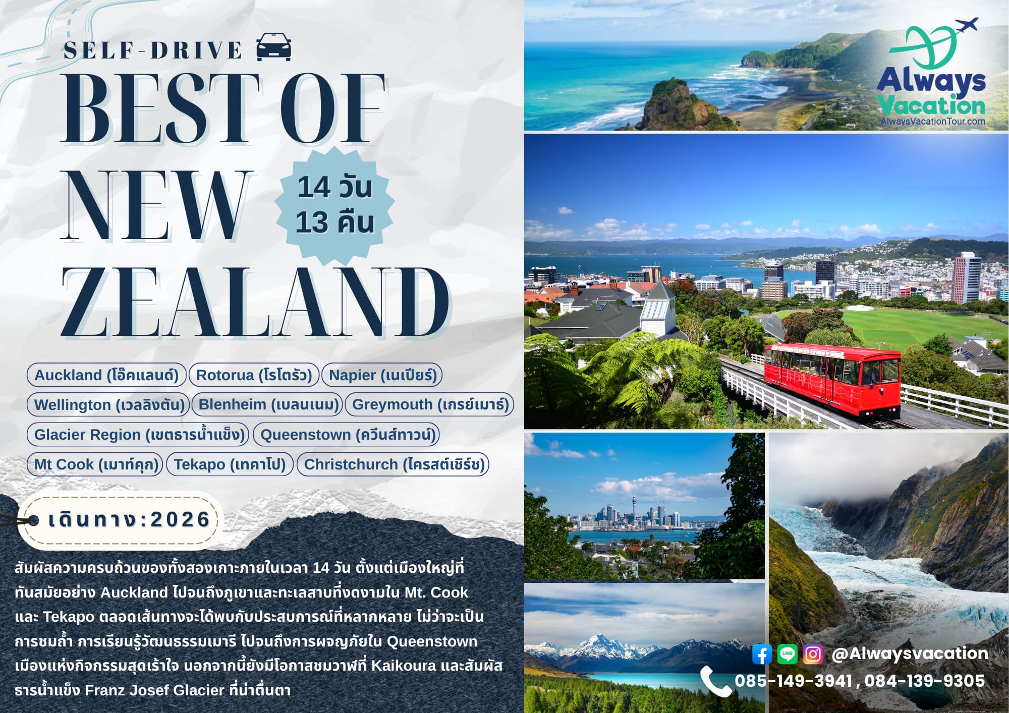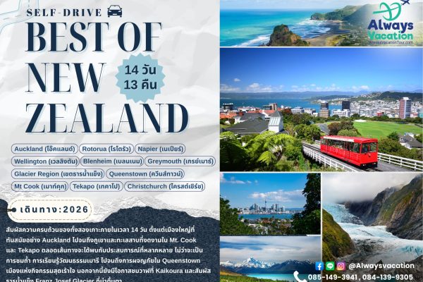 Auckland (โอ๊คแลนด์) – Rotorua (โรโตรัว) – Napier (เนเปียร์) – Wellington (เวลลิงตัน) – Blenheim (เบลนเนม) – Greymouth (เกรย์เมาธ์) – Glacier Region (เขตธารน้ำแข็ง) – Queenstown (ควีนส์ทาวน์) – Mt Cook (เมาท์คุก) – เทคาโป (Tekapo) – Christchurch (ไครสต์เชิร์ช)