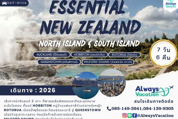 อ๊อคแลนด์ (Auckland) – ฮอบบิทตัน (Hobbiton) – โรโตรัว (Rotorua) (ไม่รวมค่าตั๋วเครื่องบิน) – ควีนส์ทาวน์ (Queenstown) – มิลฟอร์ด ซาวด์ (Milford Sound) – ควีนส์ทาวน์ (Queenstown)