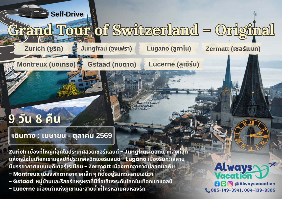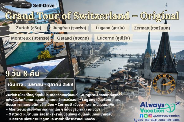 Zurich (ซูริค) – Jungfrau (จุงเฟรา) – Lugano (ลูกาโน) – Zermatt (เซอร์แมท) – Montreux (มงเทรอ) – Gstaad (กชตาด) – Lucerne (ลูเซิร์น)