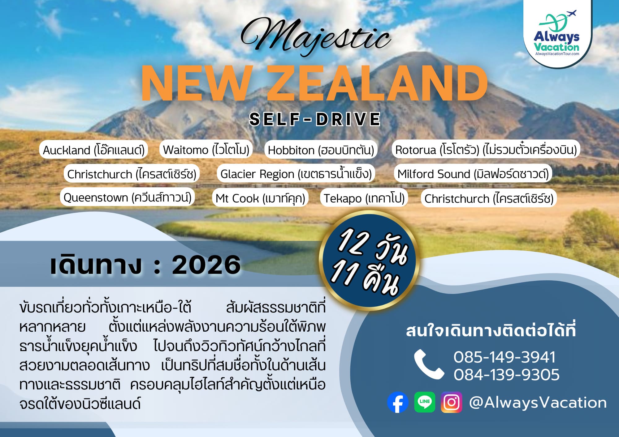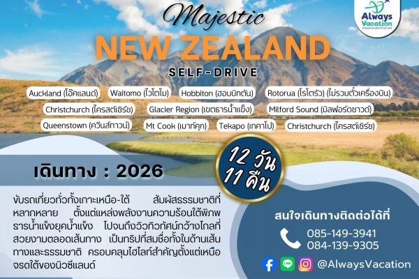 Auckland (โอ๊คแลนด์) – Waitomo (ไวโตโม) – Hobbiton (ฮอบบิทตัน) – Rotorua (โรโตรัว) (ไม่รวมตั๋วเครื่องบิน) – Christchurch (ไครสต์เชิร์ช) – Glacier Region (เขตธารน้ำแข็ง) – Milford Sound (มิลฟอร์ดซาวด์) – Queenstown (ควีนส์ทาวน์) – Mt Cook (เมาท์คุก) / Aoraki (เอโอรากิ) – Tekapo (ทะเลสาบเทคาโป) – Christchurch (ไครสต์เชิร์ช)