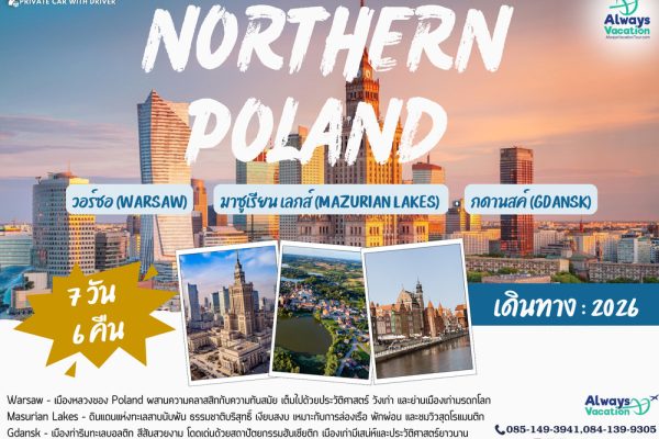 เส้นทางไฮไลท์โปแลนด์ Warsaw – Masurian Lakes – Gdansk ครบเมืองหลวง ธรรมชาติ และทะเลบอลติก พักผ่อนท่ามกลาง Masurian Lakes ดินแดนพันทะเลสาบ ธรรมชาติเงียบสงบ เป็นเอกลักษณ์ของโปแลนด์ เที่ยวเมืองเก่ามรดกประวัติศาสตร์ Warsaw & Gdansk พร้อมไกด์ส่วนตัว