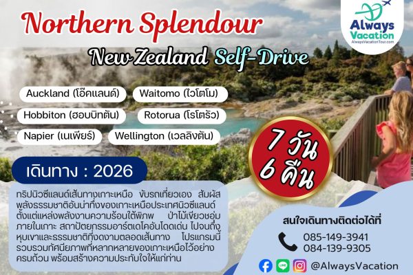 ออกเดินทางจากเมืองโอ๊คแลนด์ มุ่งหน้าสู่ ไวโตโม (Waitomo) ผ่านทิวทัศน์เนินเขาสีเขียวขจี แวะเที่ยวชมหุบเขาถ้ำใต้ดินอันน่าตื่นตา ภายในประดับด้วยแสงระยิบระยับของหนอนเรืองแสง (Glowworms) ราวกับดวงดาวบนท้องฟ้า จากนั้นเดินทางต่อสู่ มาตามาตา (Matamata) เพื่อเยี่ยมชม ฮอบบิทตัน (Hobbiton) หรือหมู่บ้านฮอบบิทชื่อดังจากภาพยนตร์ The Lord of the Rings และ The Hobbit ชมบ้านฮอบบิทน่ารัก สวนเขียวขจี และโรงเตี๊ยมสุดคลาสสิกตามฉากในภาพยนตร์ ปิดท้ายวันด้วยการเดินทางสู่เมือง โรโตรัว (Rotorua) เมืองแห่งธรรมชาติอันโดดเด่นด้วยบ่อน้ำพุร้อน ไอร้อน และกิจกรรมพลังความร้อนใต้พิภพที่หาชมได้ยาก