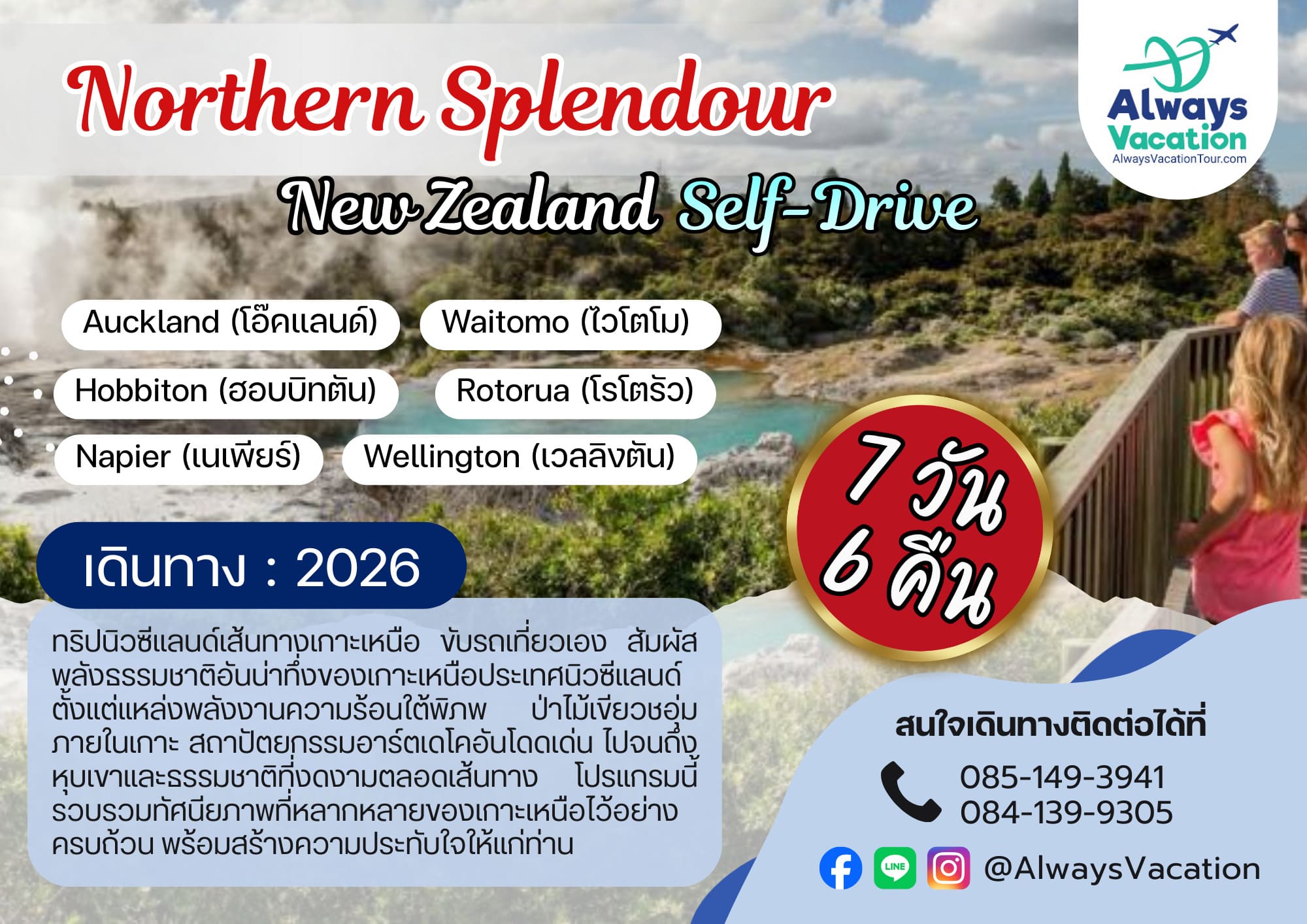 Auckland (โอ๊คแลนด์) – Waitomo (ไวโตโม) – Hobbiton (ฮอบบิทตัน) – Rotorua (โรโตรัว) – Napier (เนเพียร์) – Wellington (เวลลิงตัน)