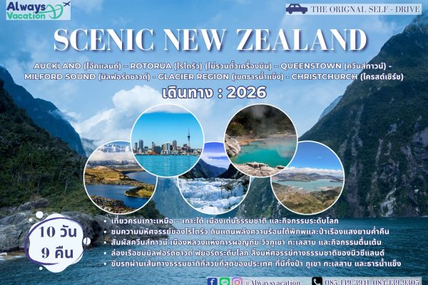 Auckland (โอ๊คแลนด์) – Rotorua (โรโตรัว) (ไม่รวมตั๋วเครื่องบิน) – Queenstown (ควีนส์ทาวน์) – Milford Sound (มิลฟอร์ดซาวด์) – Glacier Region (เขตธารน้ำแข็ง) – Christchurch (ไครสต์เชิร์ช)