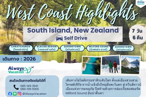 ออกเดินทางจากเมืองไครสต์เชิร์ช (Christchurch) ข้ามที่ราบแคนเทอร์เบอรี (Canterbury Plains) อันอุดมสมบูรณ์ ผ่านทัศนียภาพอันงดงามของอุทยานแห่งชาติอาเธอร์สพาส (Arthur’s Pass National Park) ก่อนมุ่งหน้าสู่ชายฝั่งตะวันตกของประเทศนิวซีแลนด์ ที่ขึ้นชื่อเรื่องธารน้ำแข็งขนาดใหญ่