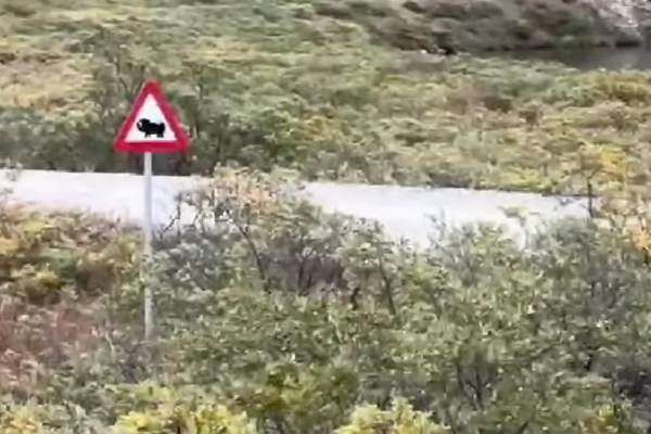 และเราจะเห็นป้ายที่มีที่เดียวในโลกคือ ป้ายระวัง Muskox (มัสก์ออกซ์) เนื่องจาก Muskox เป็นสัตว์คล้าย ๆ หน้าตาเหมือนวัว กระทิง แต่จริง ๆ เป็นตระกูลใกล้กับแพะ แกะ จะมีภาพหินแกะสลักเป็นรูป Muskox เพราะเป็นสัตว์พื้นเมือง และมีความสำคัญกับเมือง Kangerlussuaq ด้วย ชื่อว่า “Musk ox the valley”