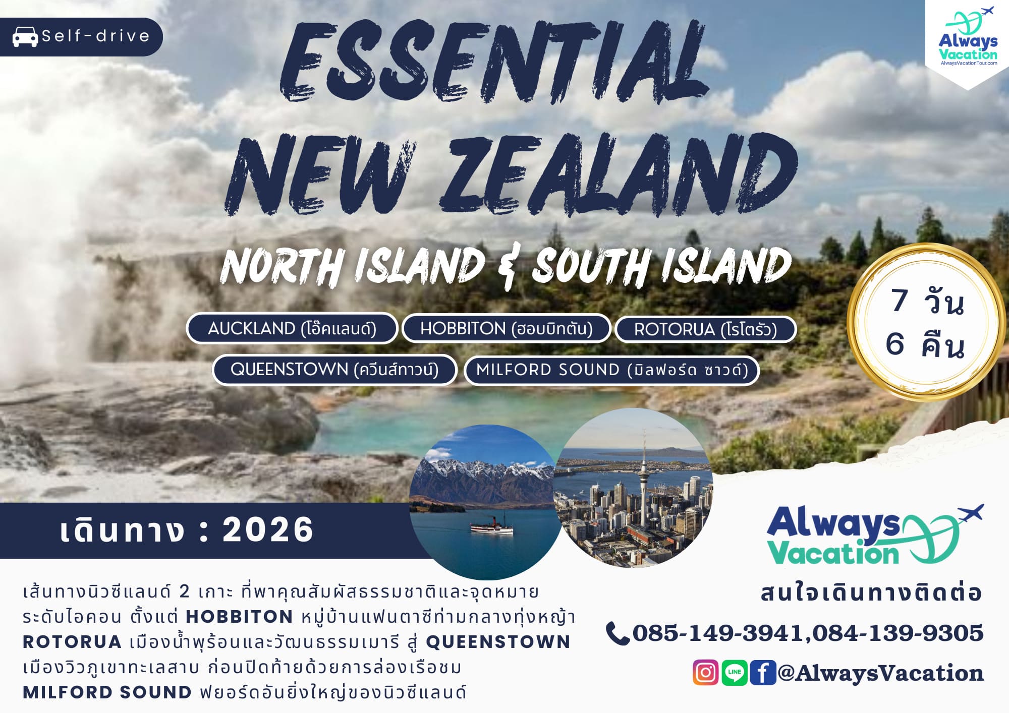 อ๊อคแลนด์ (Auckland) – ฮอบบิทตัน (Hobbiton) – โรโตรัว (Rotorua) (ไม่รวมค่าตั๋วเครื่องบิน) – ควีนส์ทาวน์ (Queenstown) – มิลฟอร์ด ซาวด์ (Milford Sound) – ควีนส์ทาวน์ (Queenstown)