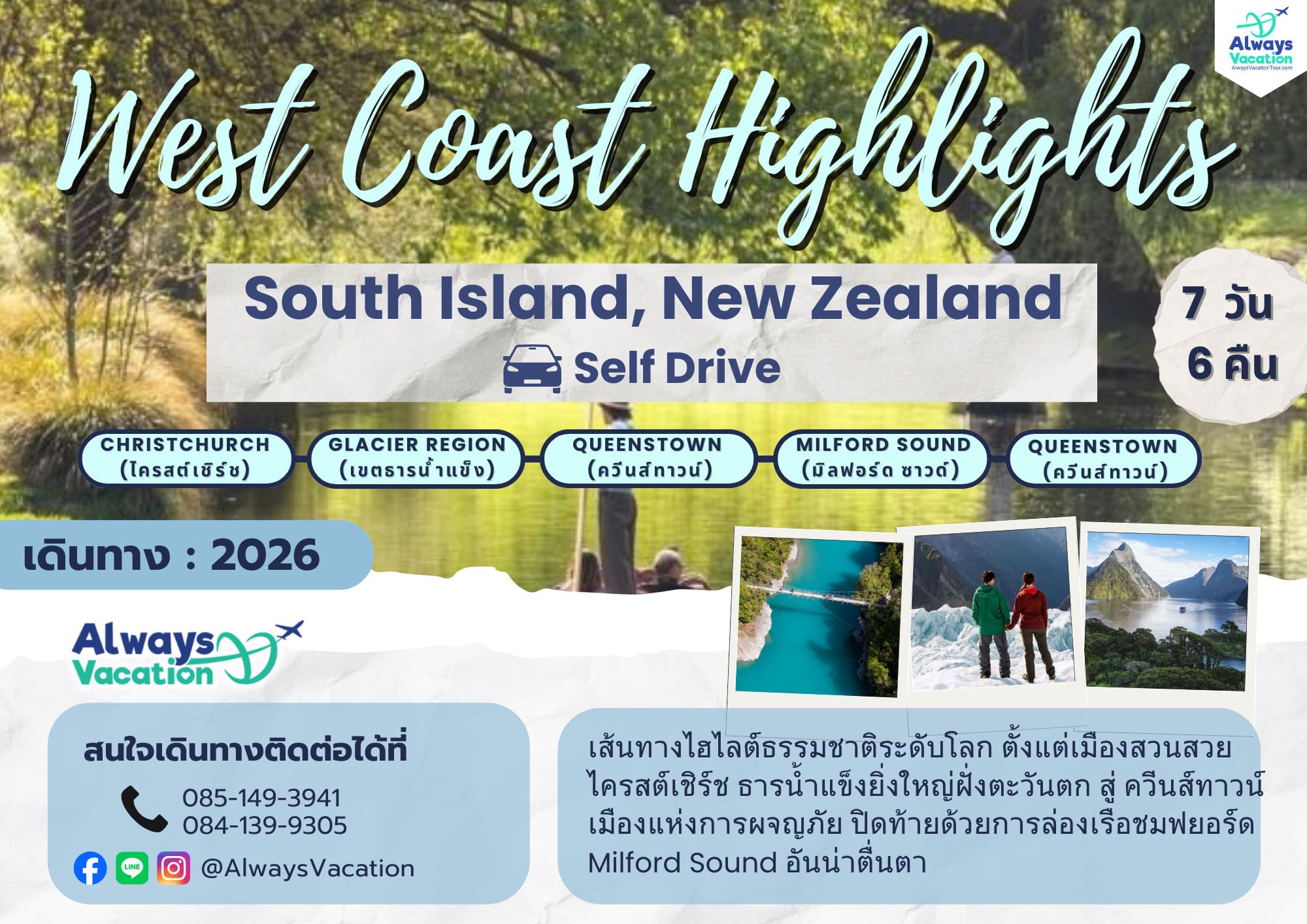 ไครสต์เชิร์ช (Christchurch) – เขตธารน้ำแข็ง (Glacier Region) – มิลฟอร์ด ซาวด์ (Milford Sound) – ควีนส์ทาวน์ (Queenstown)